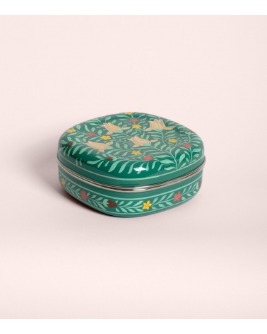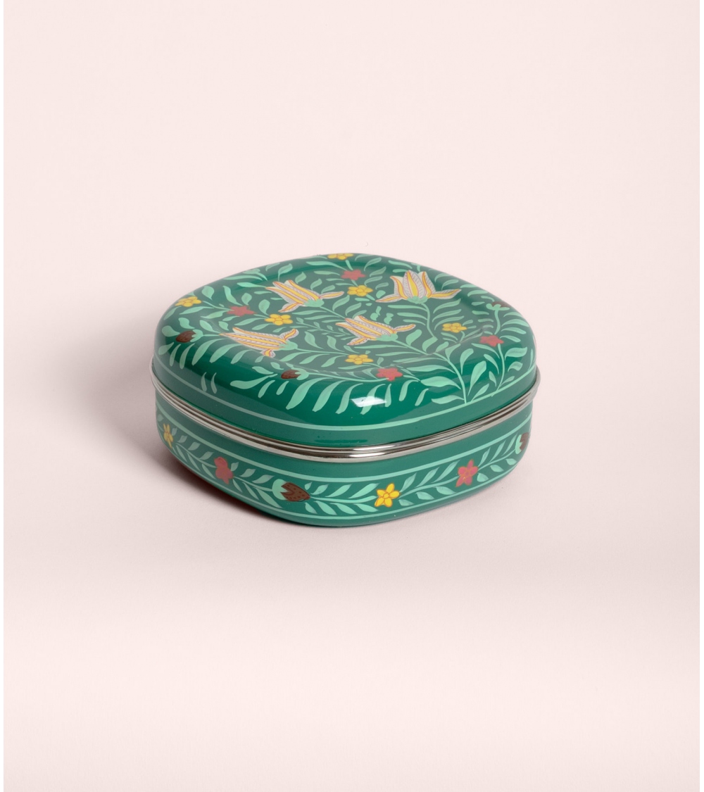 The Jamini square box is a case of Indian artisan tableware in stainless steel, hand-painted by master craftsmen from Kashmir. It is adorned with a rich palette of floral and animal motifs: lush arabesques, stylized flowers, majestic elephants, monkeys, or Bengal tigers. Perfect for storing spices or jewelry, its lid fits smoothly to protect your treasures.