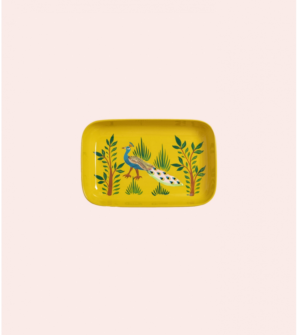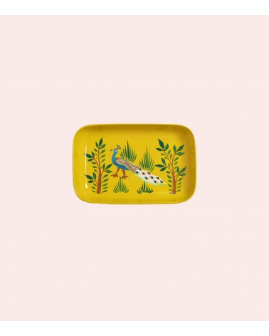 The Jamini rectangular tray is a stainless steel showcase of floral and animal motifs, boasting peacocks, lush arabesques, and stylized foliage, hand-painted by Kashmiri artisans. Perfect for serving appetizers, organizing your vanity, or accentuating a console, it blends functionality with bohemian charm.