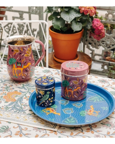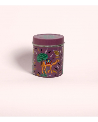 The Jamini tea box is a piece of Indian decorative tableware in stainless steel, hand-painted by master craftsmen from Kashmir. It reveals a rich symphony of floral and animal motifs: stylized flowers, royal peacocks, or majestic tigers, for a colorful and bohemian decoration. Perfect for storing tea, infusions, or spices, its hermetic opening preserves aromas and freshness.