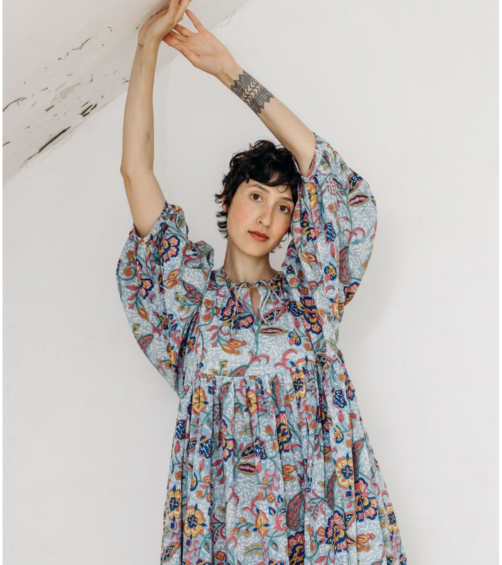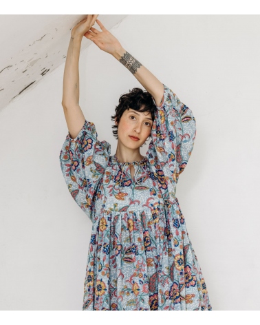 Made in India, this dress is the result of ancestral craftsmanship. Handcrafted using the traditional block printing technique native to Rajasthan, each piece is carefully created by passionate artisans. This artisanal process helps preserve the country’s unique traditions and supports local communities.