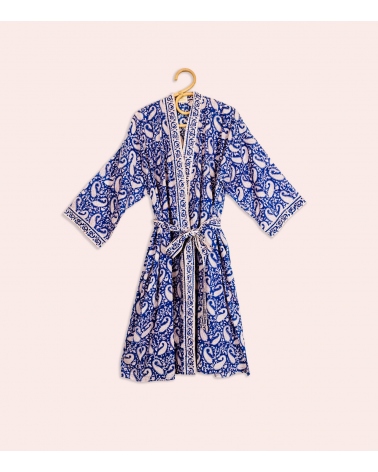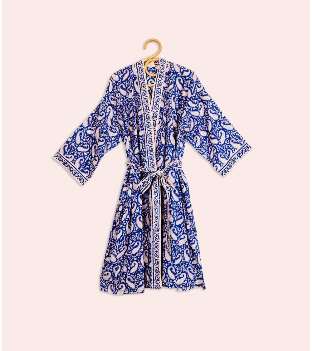 Made in India, this kimono is the result of ancestral craftsmanship. Handcrafted using the traditional block printing technique native to Rajasthan, each piece is carefully created by passionate artisans. This artisanal process helps preserve the country’s unique traditions and supports local communities.