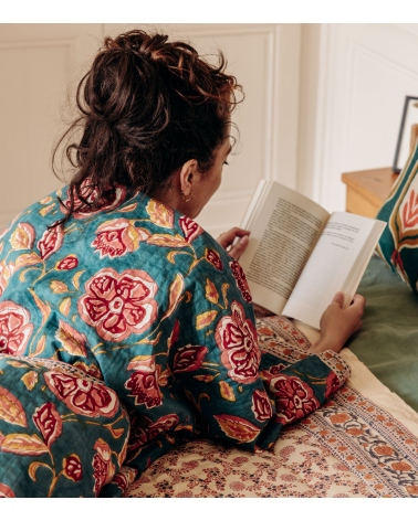 The LONI jacket is a long-sleeved quilted kimono adorned with an elegant, colorful floral motif. Its shape is tightened at the waist with a tie belt for a slim silhouette. It's a lightweight piece to wear indoors or out, over an ensemble or with simple blue jeans.