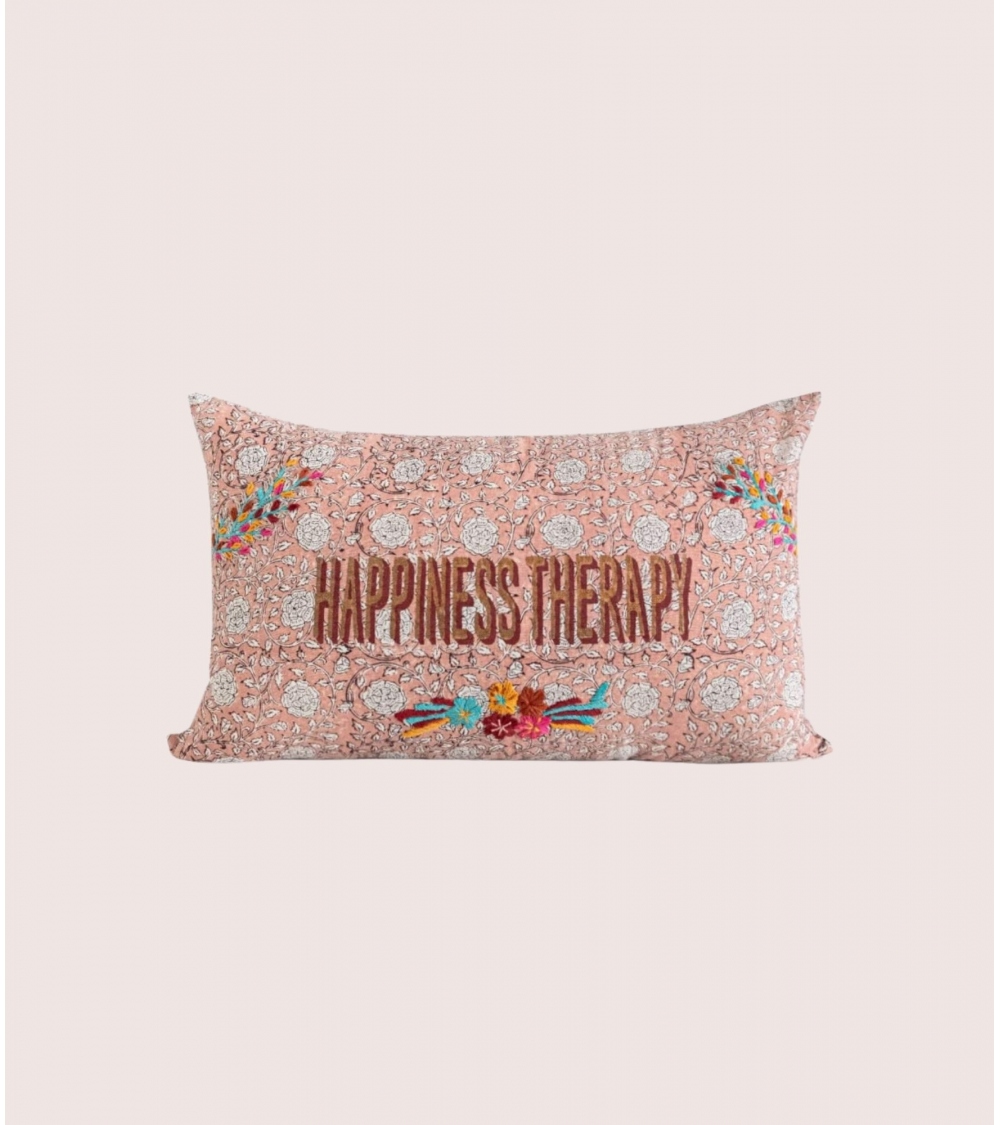 The BANA cushion cover reveals a rich palette of embroidery and color, combined with a cheerful message. Inspired by Indian street art, it will bring a poetic ambiance to your home decor.