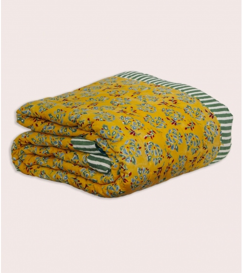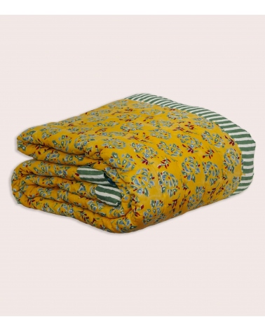 The Sarso quilt is made from 100% cotton, block-printed by hand in Rajasthan. Each motif is hand-stamped by skilled Indian artisans using hand-carved wooden blocks, a centuries-old craft that gives every piece its own character.