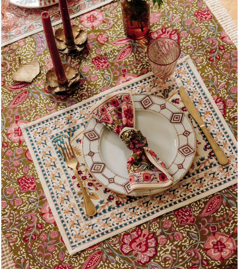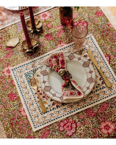 Enhance your table with the ARCHANA table mat, a radiant piece adorned with refined floral patterns. Perfect for adding a bohemian and colorful touch, this placemat creates a warm and elegant atmosphere. For perfect harmony, pair it with our matching napkins and transform your interior into a true living masterpiece.