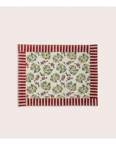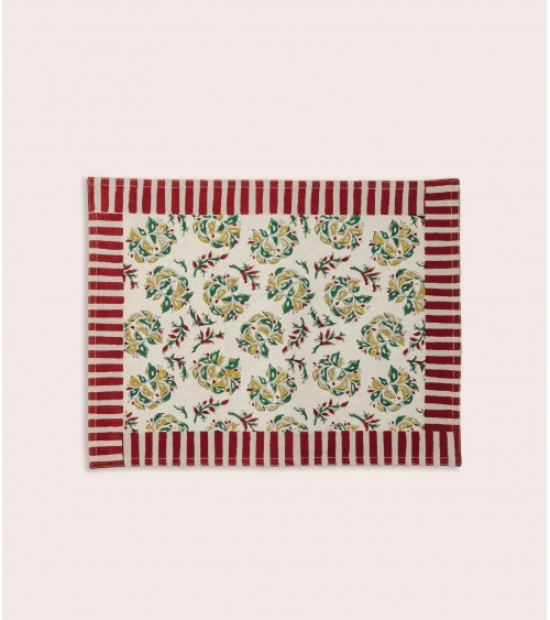 The Sarso placemat is made from 100% cotton, block-printed by hand in Rajasthan. Each motif is hand-stamped by skilled Indian artisans using hand-carved wooden blocks, a centuries-old craft that gives every piece its own character.