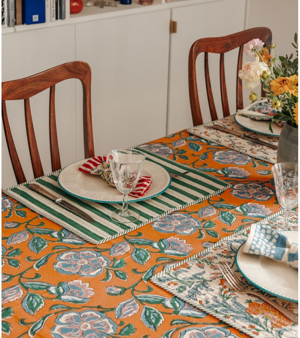 The quilted Lathi placemat is made from 100% cotton, block-printed by hand in Rajasthan. Each motif is hand-stamped by skilled Indian artisans using hand-carved wooden blocks, a centuries-old craft that gives every piece its own character.