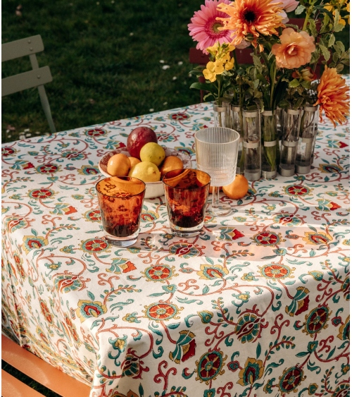 The DINTY cotton tablecloth is a bright and cheerful piece to illuminate your table with its floral pattern. Perfect for creating a colorful, bohemian atmosphere in your home, this tablecloth can be matched with our placemats and napkins for perfect harmony.