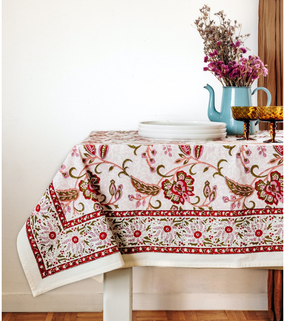 Made in India, this tablecloth is the result of ancestral craftsmanship. Handcrafted using the traditional block printing technique native to Rajasthan, each piece is carefully created by passionate artisans. This artisanal process helps preserve the country’s unique traditions and supports local communities.
