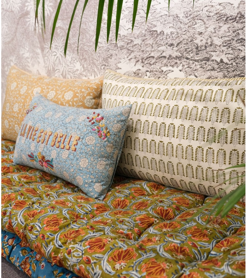 La housse de coussin BANA arbore une riche palette de couleurs et de broderies, associées à un joyeux message. Inspirée du street art indien, elle apportera une ambiance poétique à votre décoration intérieure.