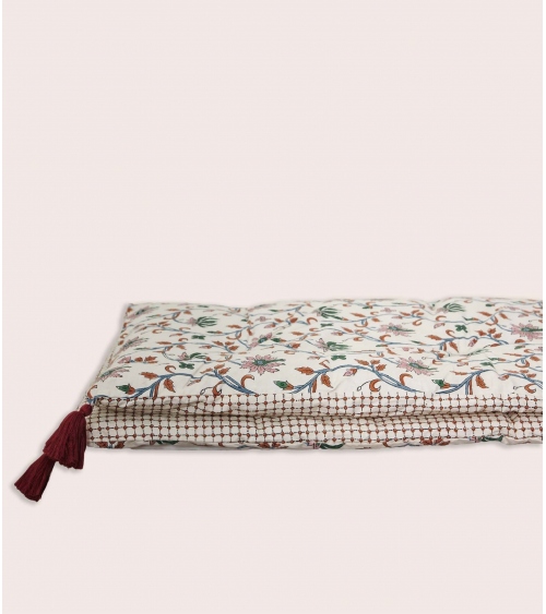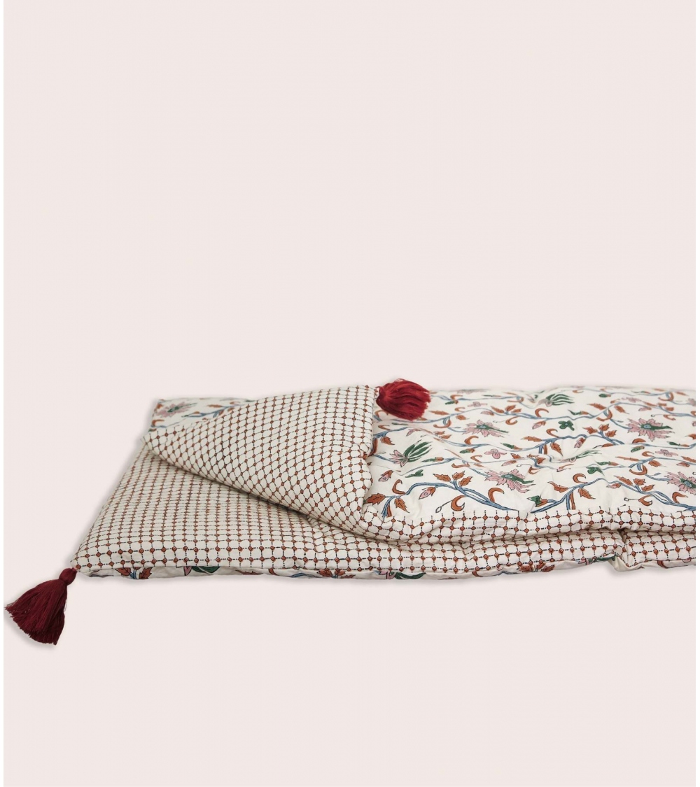 L'édredon Dinty est composé d'un revêtement en 100 % coton et d'un rembourrage en polyester, imprimé au block print. Cette technique d'impression artisanale du Rajasthan repose sur l'utilisation de tampons en bois sculptés à la main. Chaque motif est appliqué manuellement par un artisan indien maîtrisant ce savoir-faire précis, garantissant l'authenticité et l'unicité de chaque pièce.