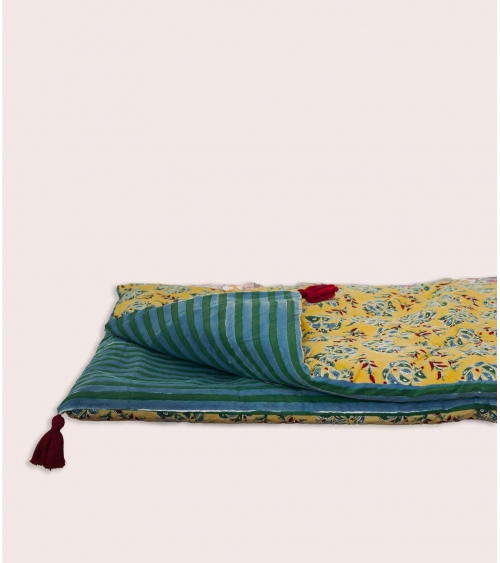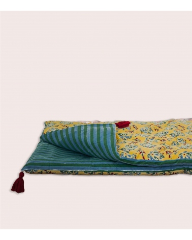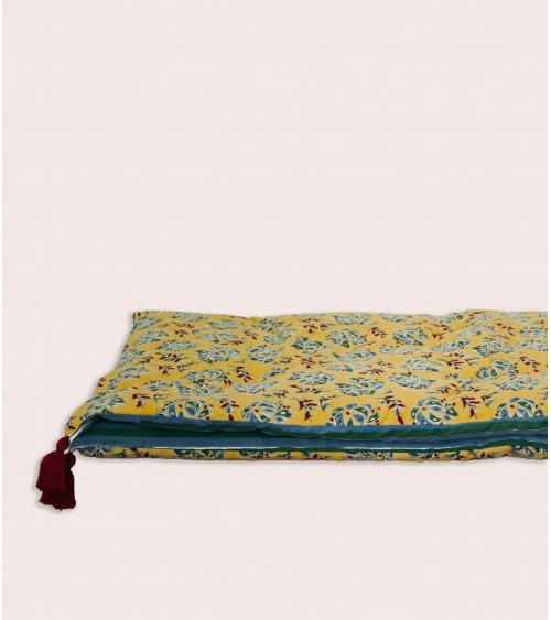 L'édredon Sarso est composé d'un revêtement en 100 % coton et d'un rembourrage en polyester, imprimé au block print. Cette technique d'impression artisanale du Rajasthan repose sur l'utilisation de tampons en bois sculptés à la main. Chaque motif est appliqué manuellement par un artisan indien maîtrisant ce savoir-faire précis, garantissant l'authenticité et l'unicité de chaque pièce.
