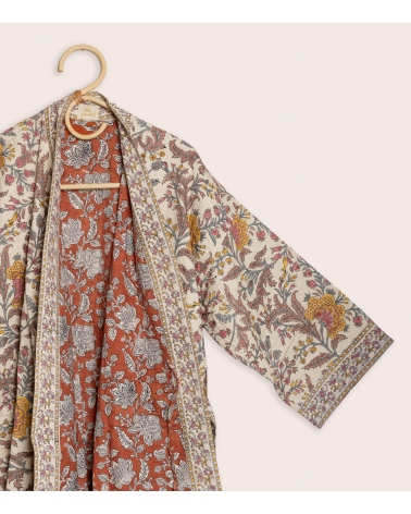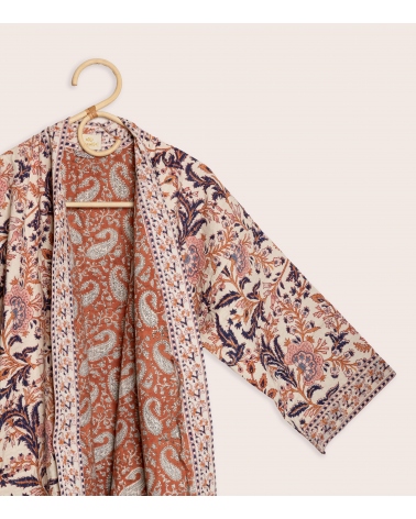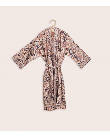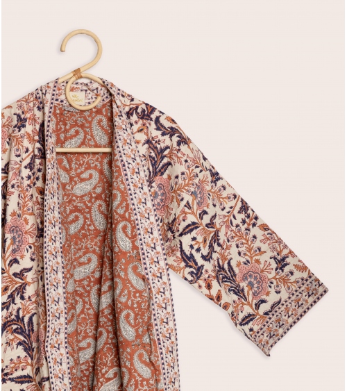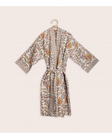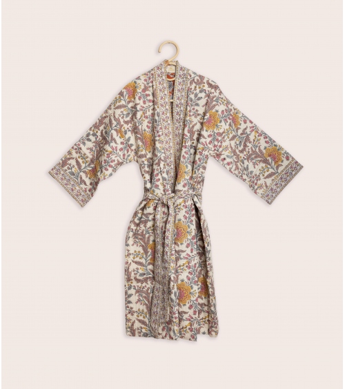 La veste ARCHANA est un kimono matelassé à manches longues paré d'un élégant motif fleuri coloré. Sa forme est resserrée à la taille grâce à une ceinture à nouer pour une silhouette élancée. C'est une pièce légère à porter en intérieur comme en extérieur par dessus un ensemble ou avec un simple jean bleu.