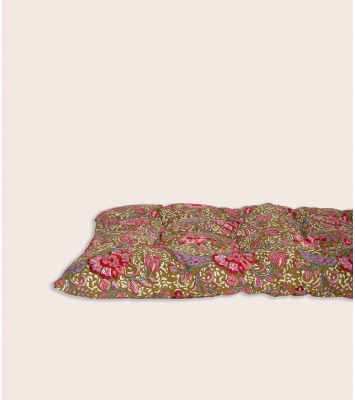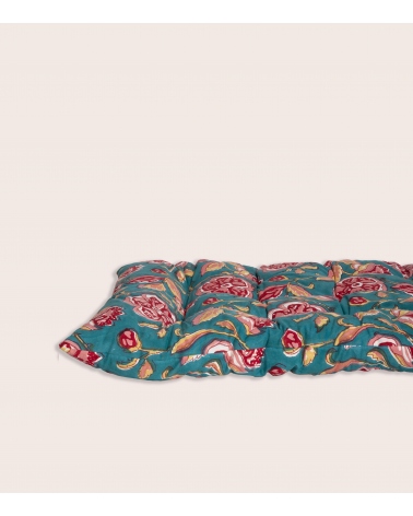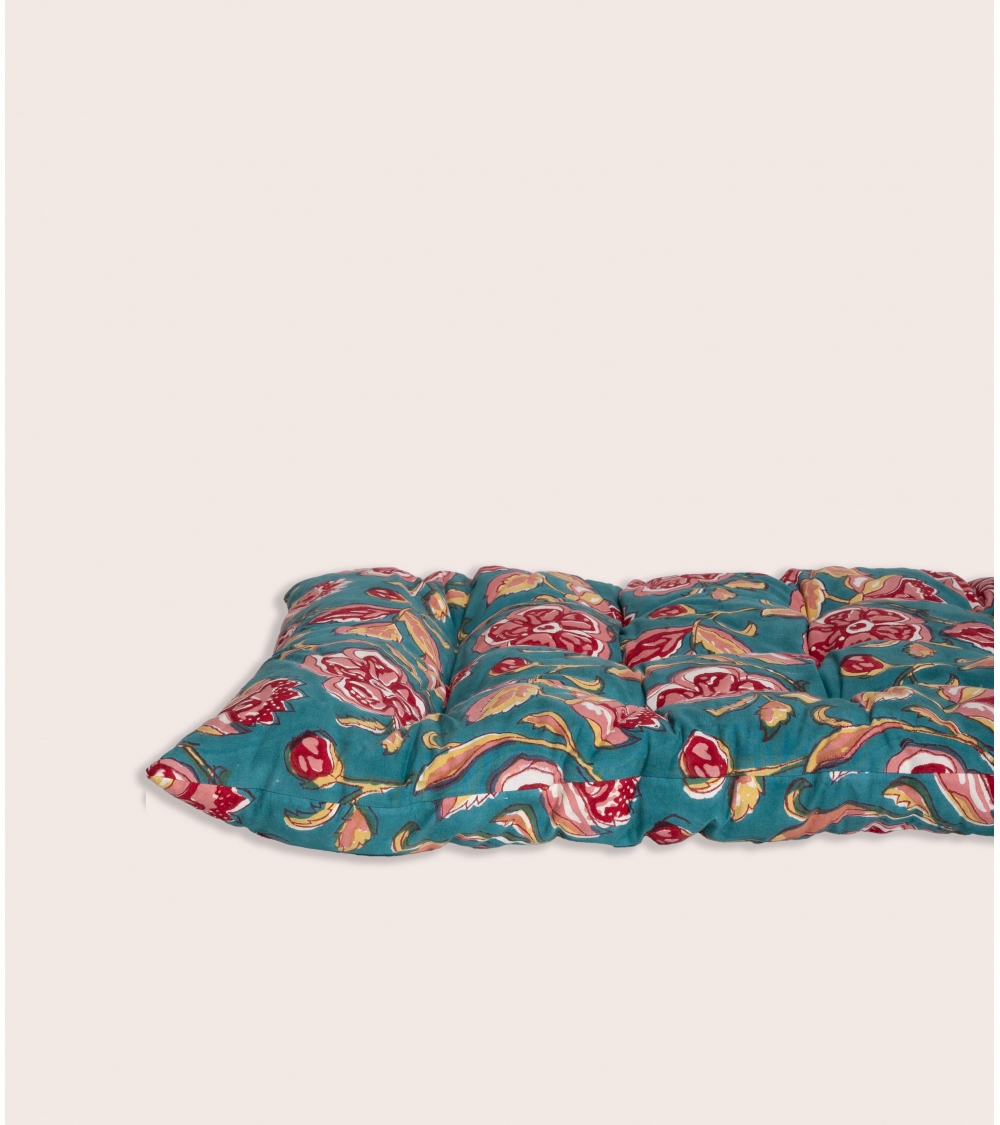 Fabriqué en Inde, ce matelas est le fruit d’un savoir-faire ancestral. Réalisé à la main selon la technique traditionnelle du blockprint, propre au Rajasthan, chaque pièce est façonnée par des artisans passionnés. Ce processus artisanal contribue à préserver les traditions uniques du pays et soutient les communautés locales.