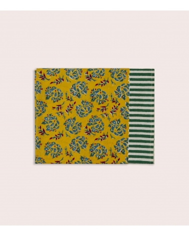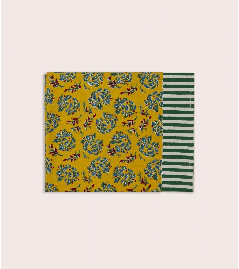 La nappe Sarso est en 100 % coton, imprimé au block print. Cette technique d'impression artisanale du Rajasthan repose sur l'utilisation de tampons en bois sculptés à la main. Chaque motif est appliqué manuellement par un artisan indien maîtrisant ce savoir-faire précis, garantissant l'authenticité et l'unicité de chaque pièce.