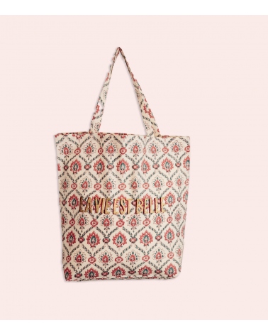 Conçu en Inde par des artisans experts utilisant la technique traditionnelle du blockprint, ce tote bag est réalisé à la main, préservant ainsi un savoir-faire ancestral du Rajasthan. Cette pièce unique soutient les communautés locales et contribue à la préservation des traditions artisanales.
