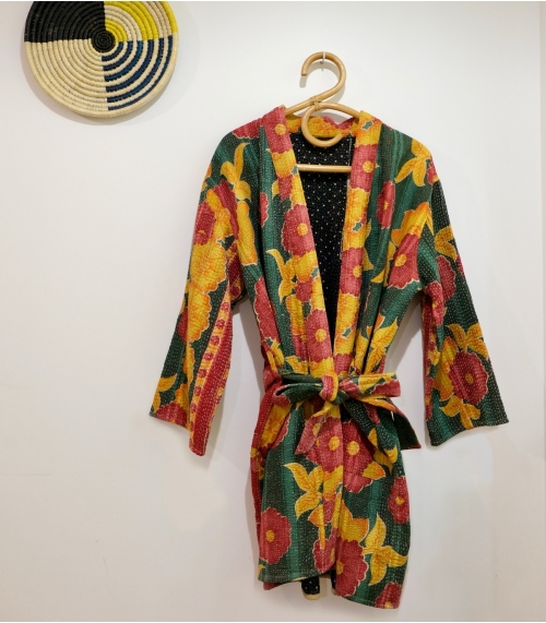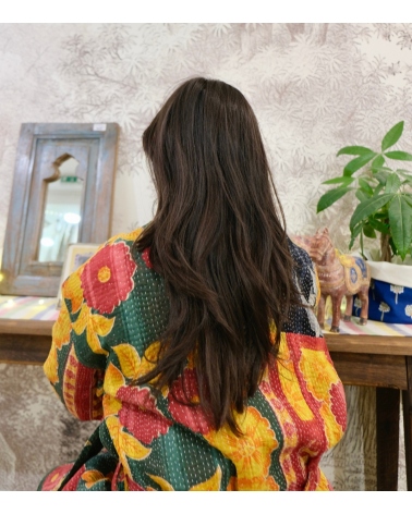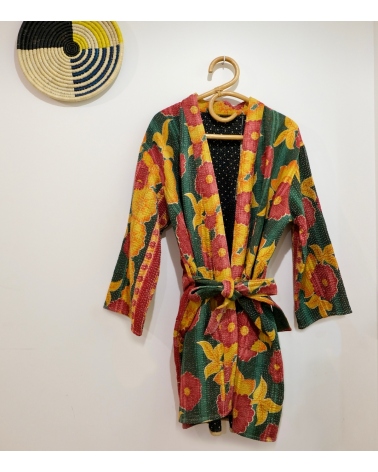 Cette veste vintage à motifs fleuris est réalisée à la main à partir de tissus recyclés et de saris portés en Inde.