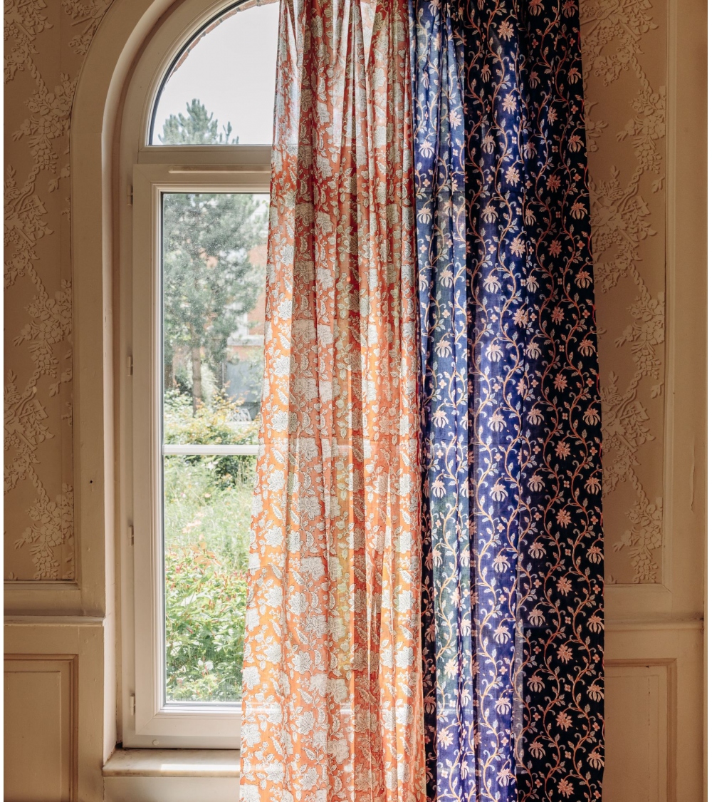 Le rideau en voile de coton RANG arbore des nuances de couleurs chatoyantes et un motif fleuri indien tout en transparence, apportant une élégance poétique à votre déco intérieure. Accumulez motifs et couleurs pour une décoration envoûtante et un intérieur raffiné.