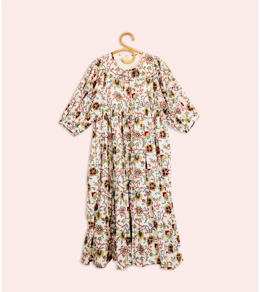 Fabriquée en Inde, cette robe est le fruit d’un savoir-faire ancestral. Réalisée à la main selon la technique traditionnelle du blockprint, propre au Rajasthan, chaque pièce est façonnée par des artisans passionnés. Ce processus artisanal contribue à préserver les traditions uniques du pays et soutient les communautés locales.