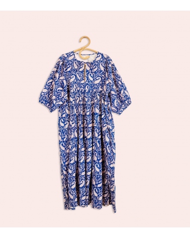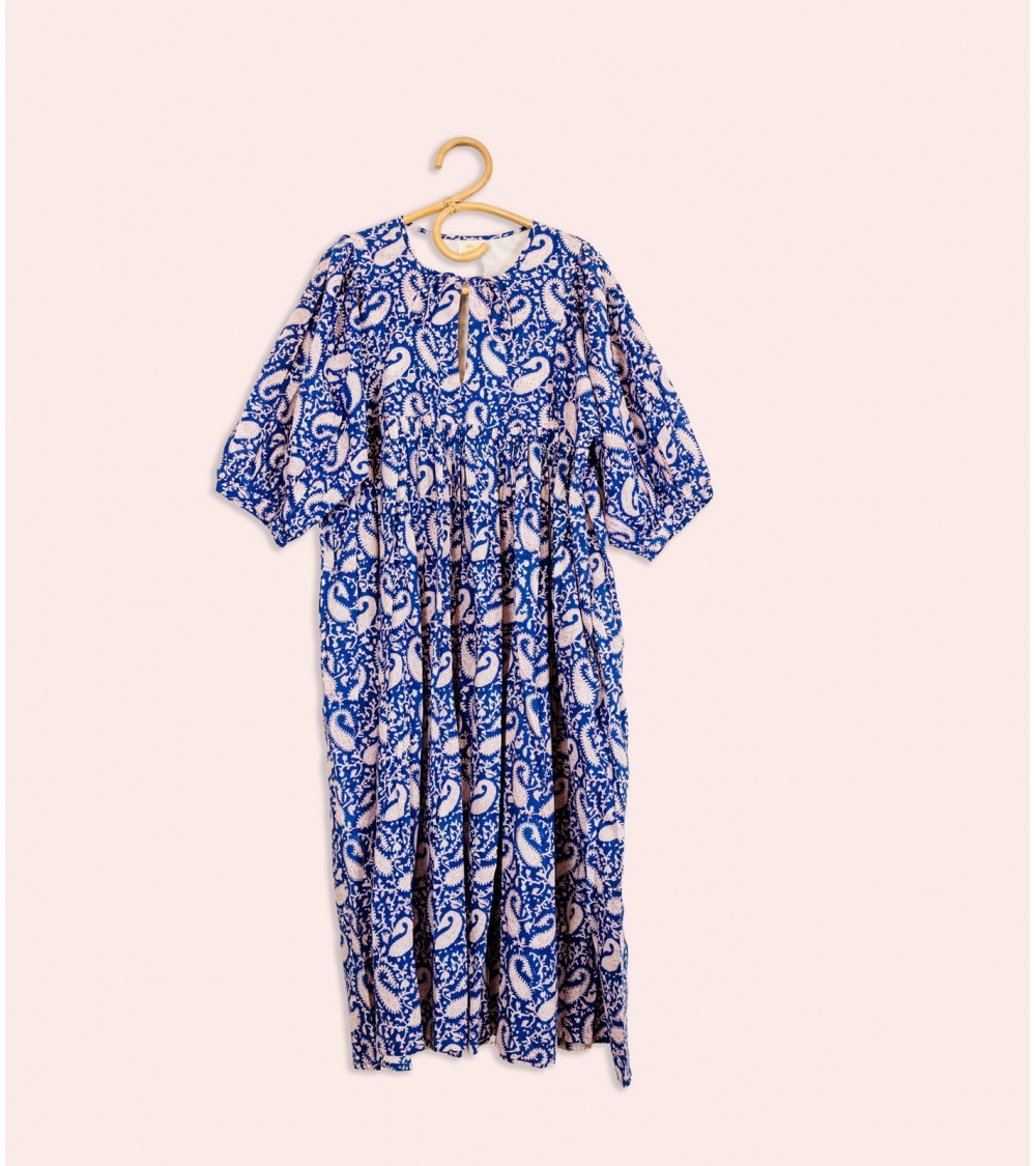 Fabriquée en Inde, cette robe est le fruit d’un savoir-faire ancestral. Réalisée à la main selon la technique traditionnelle du blockprint, propre au Rajasthan, chaque pièce est façonnée par des artisans passionnés. Ce processus artisanal contribue à préserver les traditions uniques du pays et soutient les communautés locales.