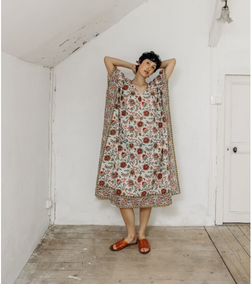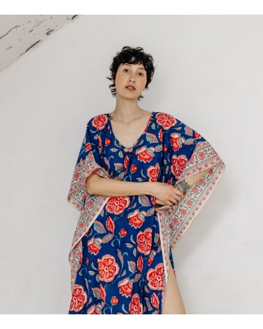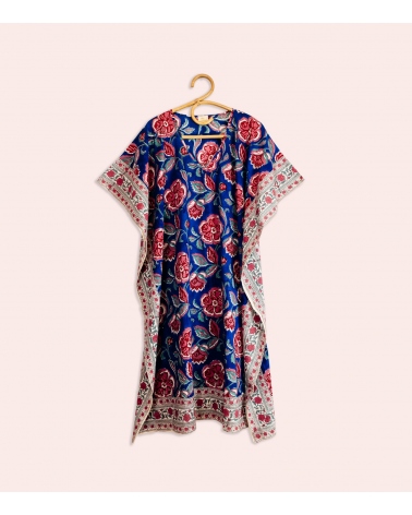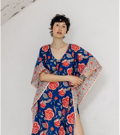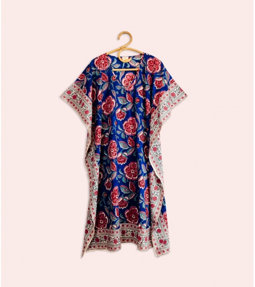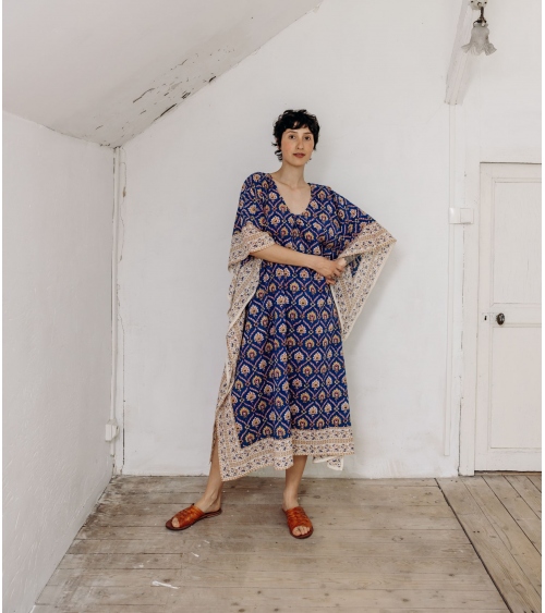 Fabriqué en Inde, ce kaftan est le fruit d’un savoir-faire ancestral. Réalisée à la main selon la technique traditionnelle du blockprint, propre au Rajasthan, chaque pièce est façonnée par des artisans passionnés. Ce processus artisanal contribue à préserver les traditions uniques du pays et soutient les communautés locales.
