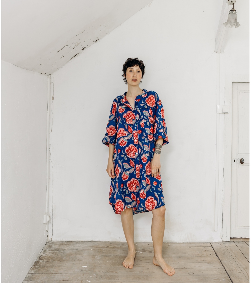 Chaque robe chemise est une création unique, marquée par des irrégularités naturelles et une texture singulière. L’impression artisanale, réalisée à la main, peut comporter de légères variations, reflet du soin minutieux et du savoir-faire transmis à chaque étape de sa fabrication.