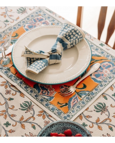Fabriqué en Inde, ce set de table incarne l'excellence d’un savoir-faire ancestral. Réalisé selon la technique traditionnelle du blockprint, propre au Rajasthan, chaque pièce est confectionnée à la main par des artisans passionnés. Un geste précieux pour préserver des traditions artisanales uniques et soutenir les communautés locales.