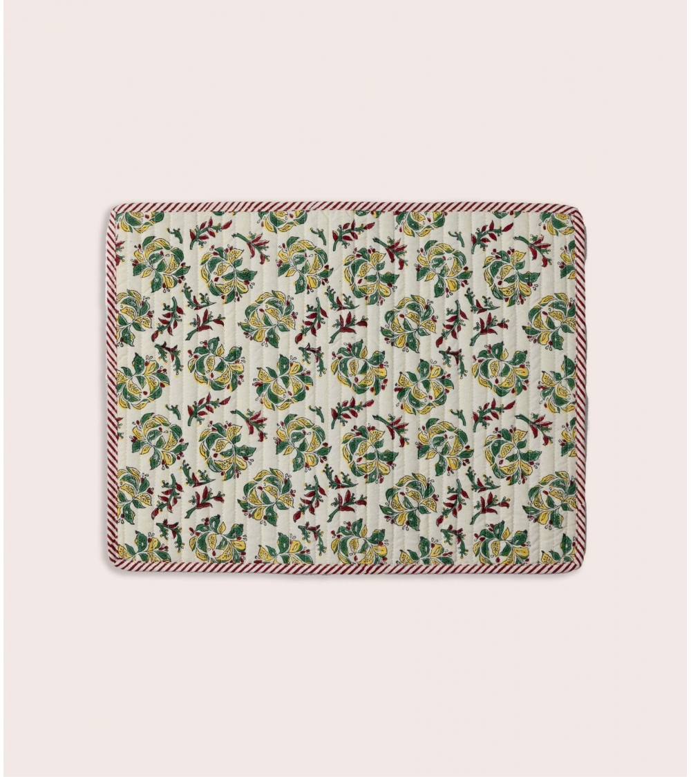 Le set de table matelassé Sarso est en 100 % coton, imprimé au block print. Cette technique d'impression artisanale du Rajasthan repose sur l'utilisation de tampons en bois sculptés à la main. Chaque motif est appliqué manuellement par un artisan indien maîtrisant ce savoir-faire précis, garantissant l'authenticité et l'unicité de chaque pièce.
