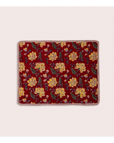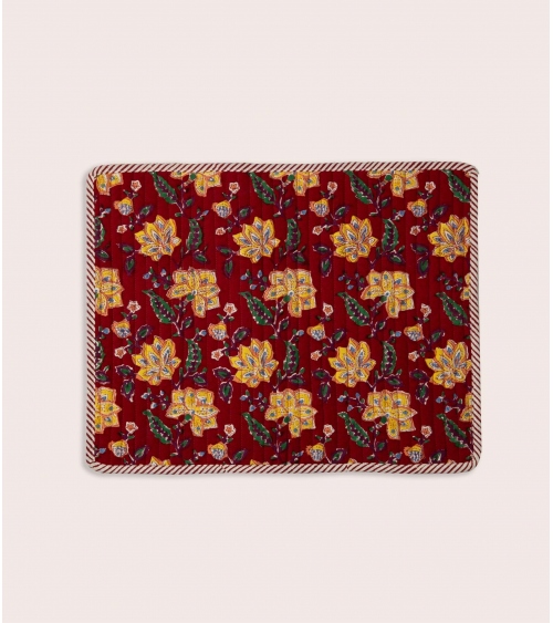 Le set de table matelassé Rang est en 100 % coton, imprimé au block print. Cette technique d'impression artisanale du Rajasthan repose sur l'utilisation de tampons en bois sculptés à la main. Chaque motif est appliqué manuellement par un artisan indien maîtrisant ce savoir-faire précis, garantissant l'authenticité et l'unicité de chaque pièce.