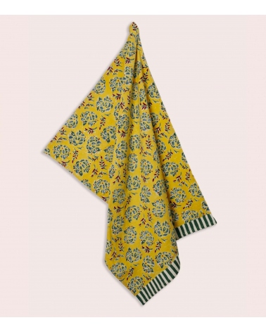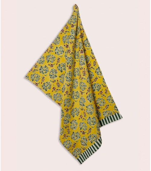 Le torchon Sarso est en 100 % coton, imprimé au block print, une technique traditionnelle du Rajasthan où chaque motif est appliqué à la force du poignet à l'aide de tampons en bois sculptés à la main.