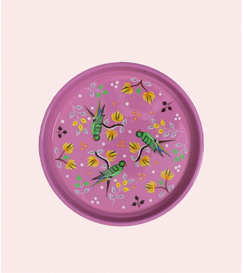 Nos plateaux ronds sont forgés en inox puis peints à la main par des maîtres artisans du Cachemire, chaque pièce reflétant un savoir-faire artisanal indien et garantissant une vaisselle colorée et unique.