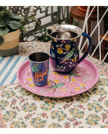 Le plateau rond Jamini est un écrin de vaisselle décorative indienne en inox, peint à la main par des artisans du Cachemire. Il déploie une rondeur poétique ornée de motifs fleuris et animaliers : arabesques végétales, fleurs stylisées, paons royaux ou tigres majestueux, pour une décoration bohème et colorée. Parfait pour présenter apéritifs, pâtisseries ou boissons, il se prête aussi bien à un usage quotidien qu’à une mise en scène déco inspirée de voyages sur votre table ou buffet.