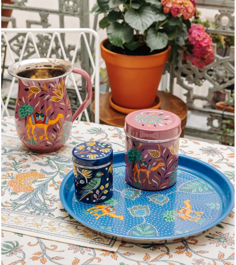 La boîte à thé Jamini est un écrin de vaisselle déco indienne en inox, peint à la main par des maîtres artisans du Cachemire. Elle dévoile une riche symphonie de motifs fleuris et animaliers : fleurs stylisées, paons royaux ou tigres majestueux, pour une décoration colorée et bohème. Parfaite pour conserver thé, infusions ou épices, son ouverture hermétique préserve arômes et fraîcheur.