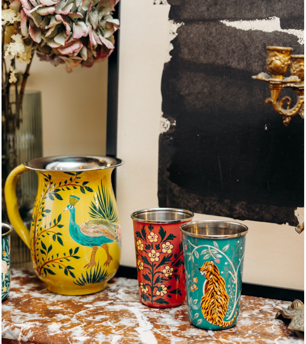 La carafe Jamini est une pièce de vaisselle déco artisanale indienne en inox, peinte à la main par des maîtres artisans du Cachemire. Elle se pare d’une profusion de motifs fleuris et animaliers, tels que des tigres du Bengale, éléphants rêveurs et arabesques végétales, pour habiller votre table d’un charme bohème, coloré et voyageur. Idéale pour présenter eau, jus, vins ou infusions, elle transforme chaque instant de partage en une escapade colorée.